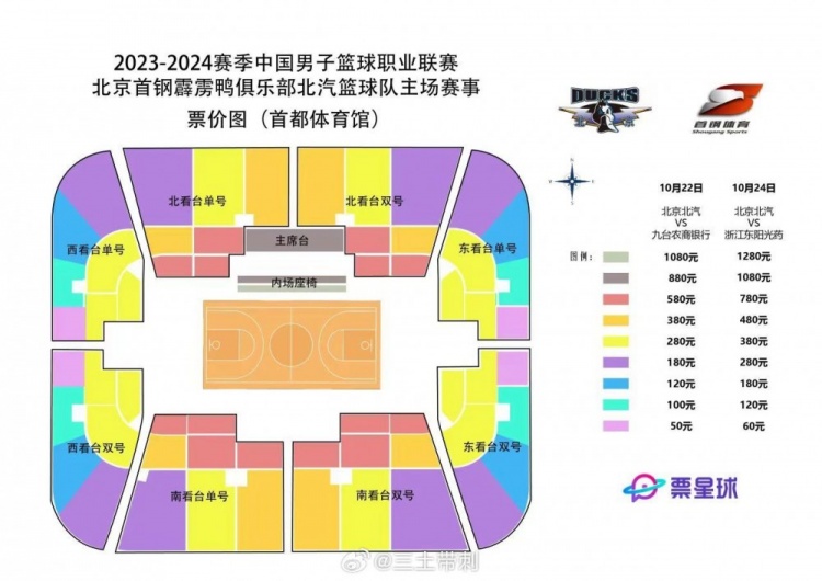 此外,北京男篮新赛季第2个主场(10月24日晚上7点35分对阵广厦)比赛的票价也分为9个档次,其中最便宜的票价为60元,最贵的票价为1280元。