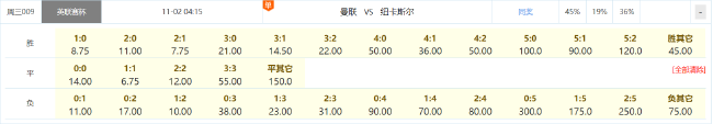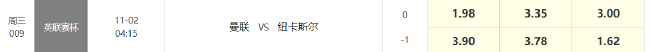 竞彩官方开出了比分赔率,其中双方1-1战平赔率最低为1赔6.75,其次是曼联2-1与1-0取胜分别为1赔7.75、1赔8.75;纽卡斯尔联方面,赢球最低赔为2-1的1赔10.00;双方2-2战平赔率为1赔12.00。结合胜平负开出1.98 3.35 3.00组合来看,英联杯卫冕冠军曼联虽然占据主场之利,体能远比连续客战的纽卡斯尔联占优,但想要借主场之利常规时间拿下纽卡着实不易,或许常规时间战平拖入点球大战的可能性更大。