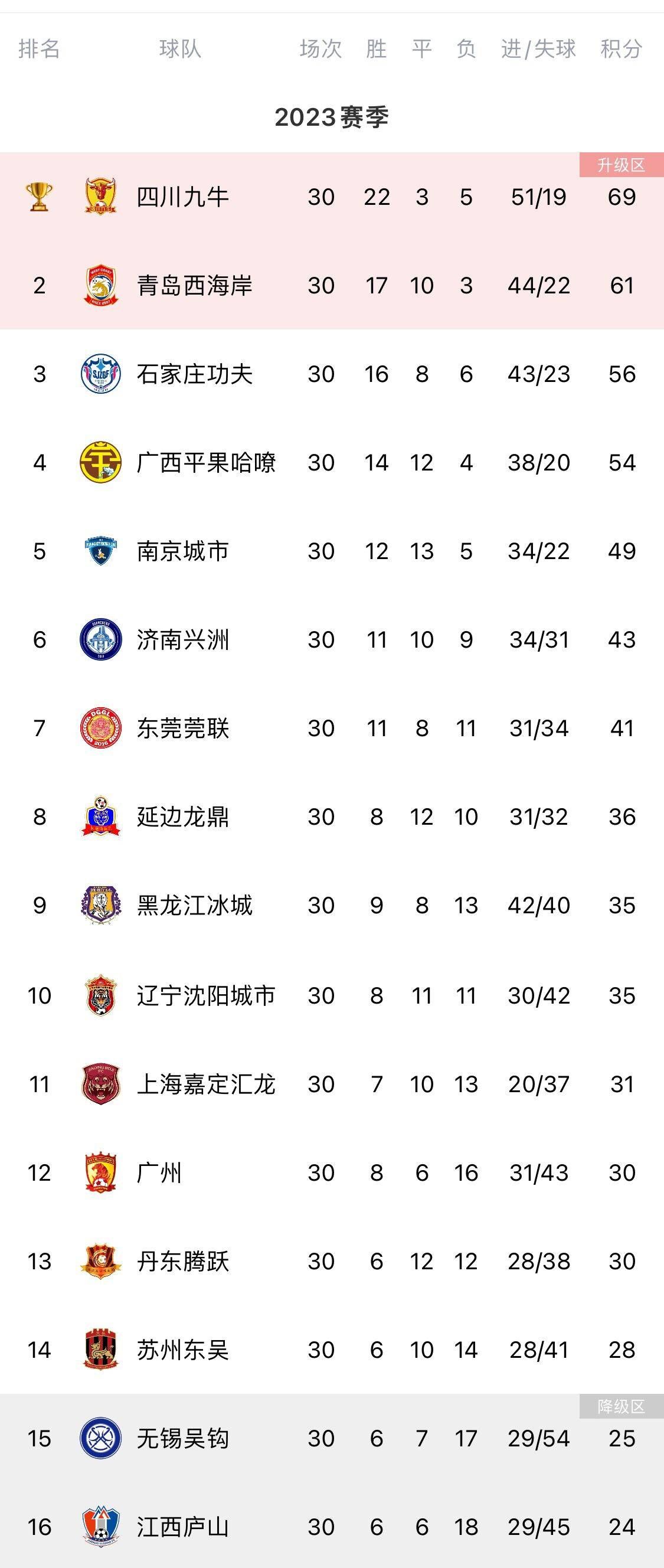 11月05日讯 2023赛季中甲联赛今日迎来收官战,四川九牛夺冠,与青岛西海岸一起冲超!江西庐山、无锡吴钩垫底降入乙级;全华班广州队最终获得第12名;中乙冠亚军重庆铜梁龙、大连智行下赛季升上中甲。