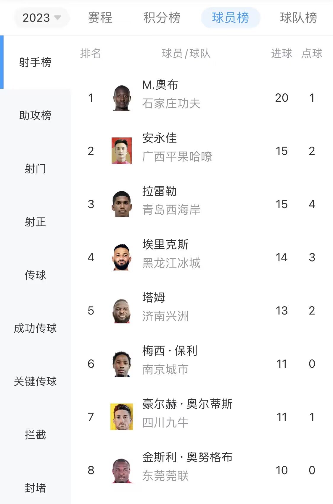中甲射手榜前三:奥格布(石家庄功夫)20球;安永佳(广西平果哈嘹)15球;拉雷勒(青岛西海岸)15球