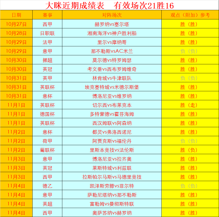 再次恭喜昨天选择信任笔者的友友们,昨天送出的4场比赛取得4中,状态火热;近21胜16的成绩,不但是近期状态了得的信号,也是长期而且稳定的表现;笔者今天会再接再厉,继续精挑细选出信心十足的比赛场次来送给大家,同时也希望可以将胜利的喜悦与大家一起分享。