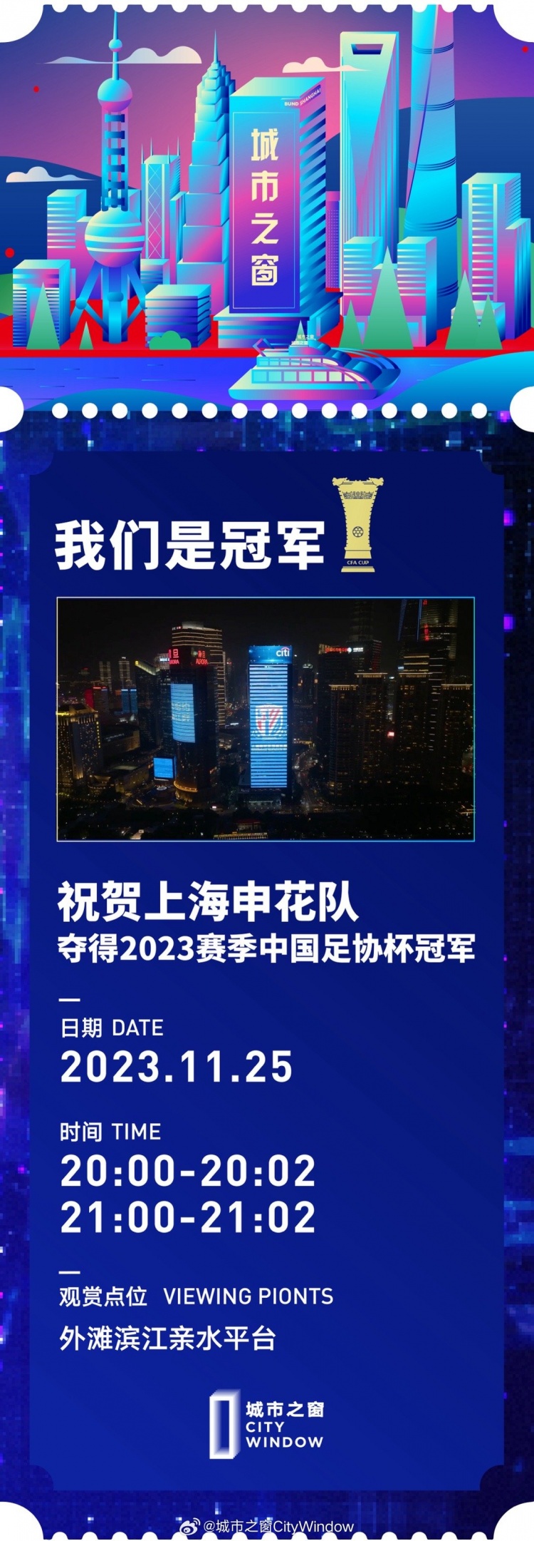 据上海滨江星广告传播有限公司官方消息,上海外滩将于11月25日20:00-20:02和21:00-21:02两个时段亮起灯光,祝贺上海申花队获得2023赛季足协杯冠军。