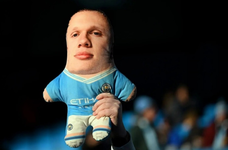 11月25日讯 本轮英超榜首大战即将打响,曼城将在主场迎战利物浦。赛前,有蓝月球迷举起了自制的哈兰德大头娃娃,看起来有些怪异。