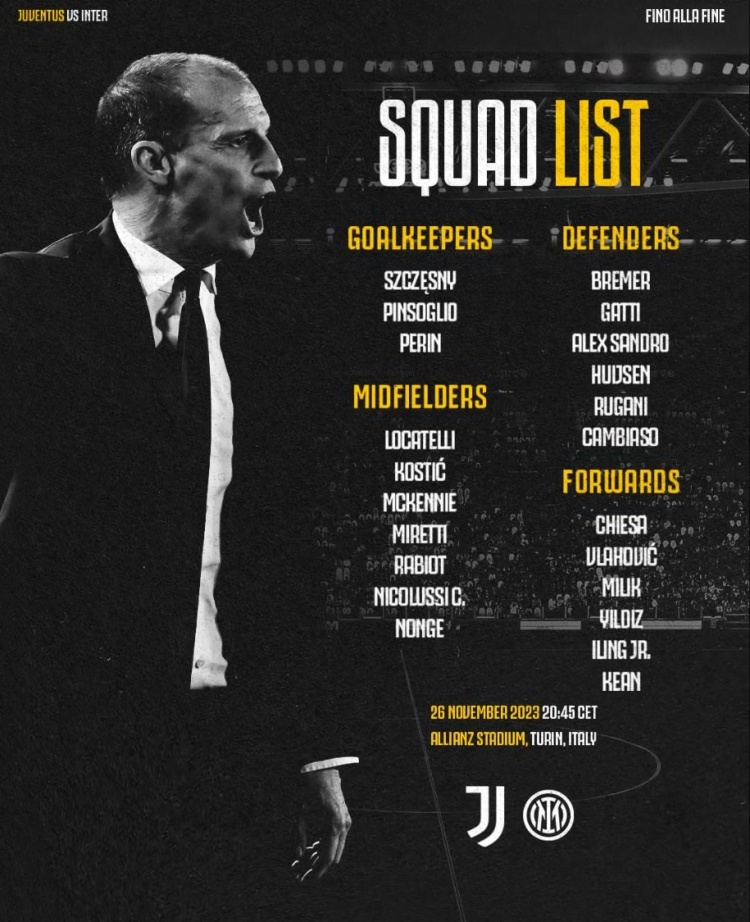 11月26日讯 北京时间11月27日凌晨3:45,2023-24赛季意甲联赛第13轮,尤文图斯主场迎战国际米兰。赛前,尤文图斯官方公布了本场比赛球队大名单,弗拉霍维奇领衔锋线,拉比奥特坐镇中场。