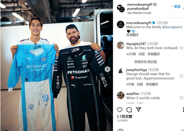 梅赛德斯车队官方更新了社媒动态,晒出拉塞尔和阿圭罗交换赛车服的照片。