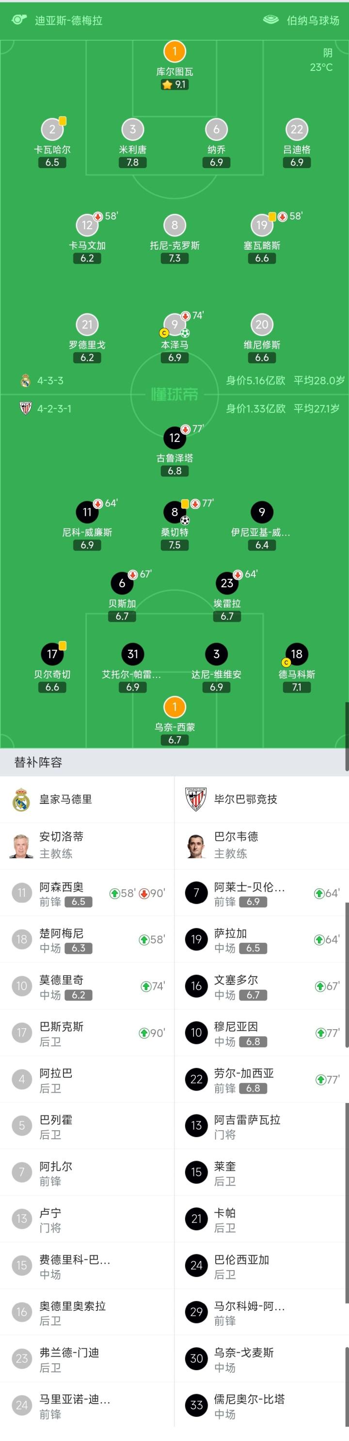 比赛进行到第74分钟,本泽马带着热烈的掌声被换下,他完成了本赛季的最后一次出场。这也是他在皇马的告别战。此后,阿森西奥被换下,阿扎尔没有机会出场。