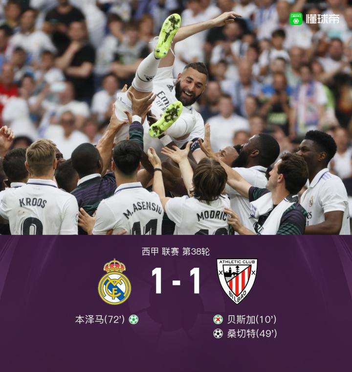 皇马主场1-1战平毕尔巴鄂竞技,贝尔加点未果,本泽马告别战进球-足球直播-球探比分直播