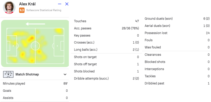 捷克队在本场比赛中轻松取得了3-0的胜利。而卡拉尔作为该队首发出场的前锋,也没有浪费这次机会。他本场比赛获得了6.3分,完成了2次射门和2次过人,全部成功。他有着47次触球和36脚传球,传球成功率达到了78%。