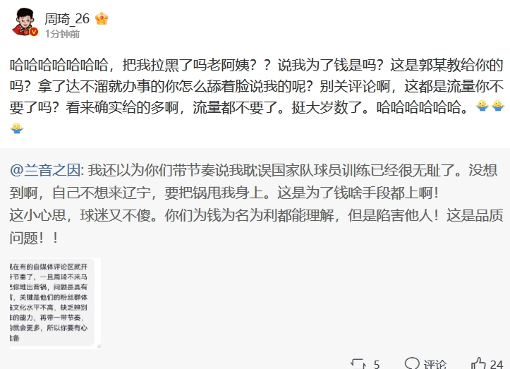 最近,一场关于周琦转会的争议再次引发热议。媒体人@兰音之因在社交媒体上发表长文,指责周琦不想加盟辽宁队,却将责任转嫁给兰音之因。他称周琦为了钱不择手段,煽动舆论误导粉丝。这一指责引发了周琦的不满,他在评论区回应称兰音之因为了流量而不择手段,取笑对方年纪大。