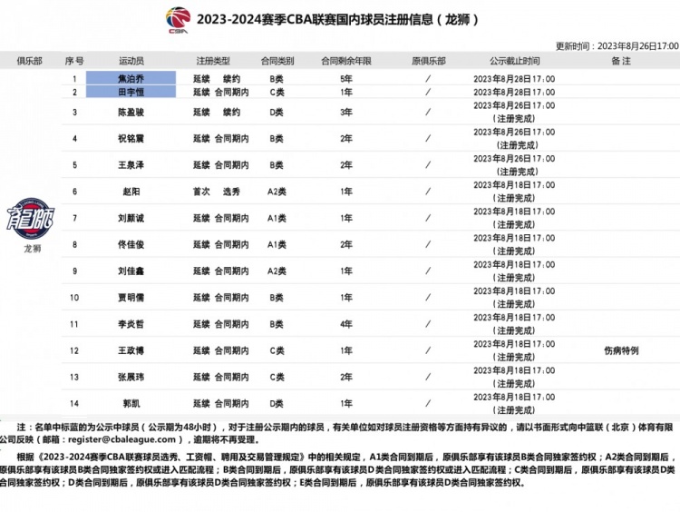 其中,焦泊乔以5年B类合同续约球队,田宇恒的C类合同还剩1年。