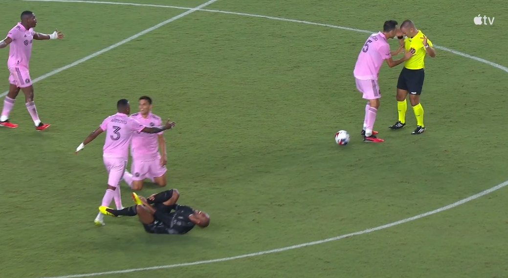 上半场临近结束时,迈阿密国际中场戈麦斯铲球染黄,布斯克茨不满判罚找裁判理论,直接将手放到了主裁身上,主裁双手张开并退后,示意不要进行身体接触。