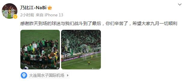 9月1日讯 今天,国安球员乃比江在社媒发文,致谢了昨晚足协杯现场观赛的国安球迷。
