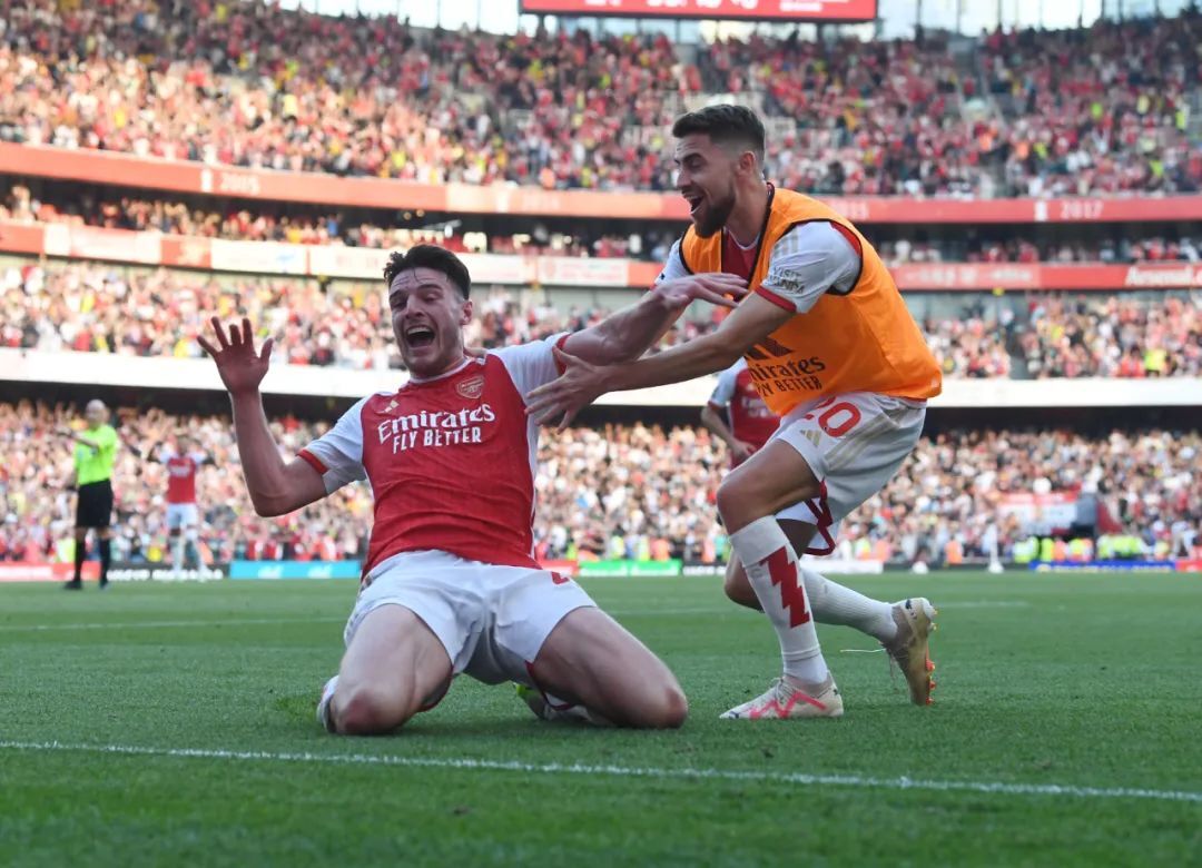 第96分钟,萨卡右侧角球传中,赖斯后点停球抽射破门,2比1!