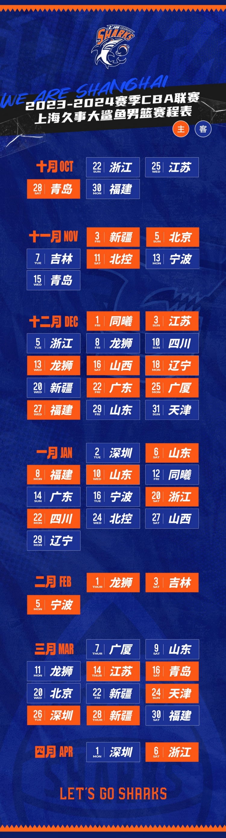 9月27日讯 上海男篮官博更新,分享球队新赛季常规赛具体赛程。