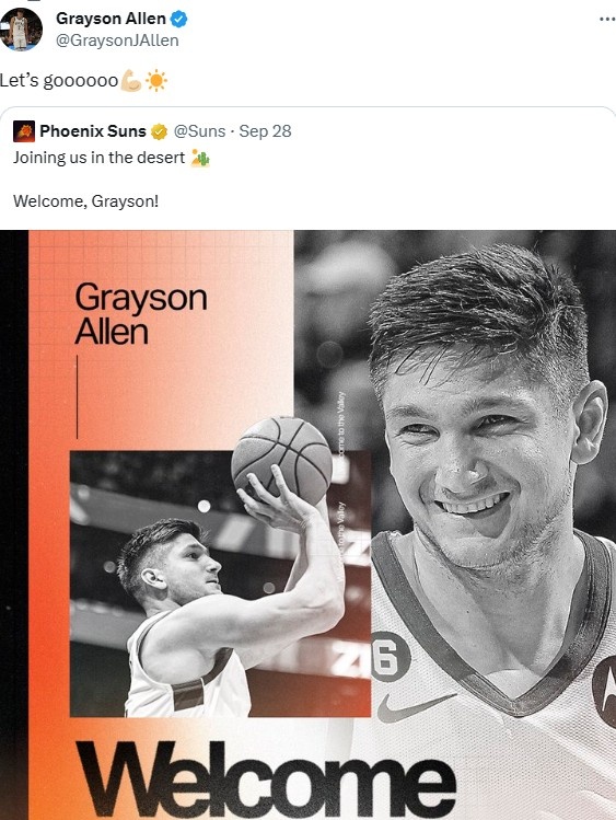 10月2日讯 今天,太阳后卫格雷森-阿伦转发了球队欢迎他的推特,并写道:让榴莲视频….www冲啊。