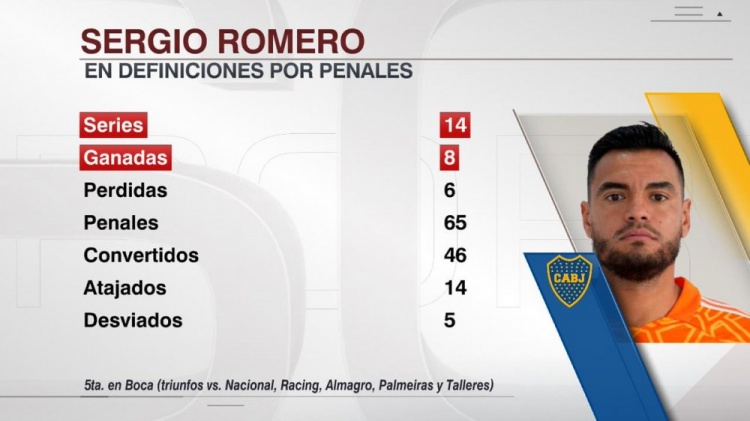 ESPN统计了博卡门将罗梅罗职业生涯至今点球大战的数据,他总计参加14场点球大战,赢下其中8场,而加盟博卡后5场点球大战全胜。