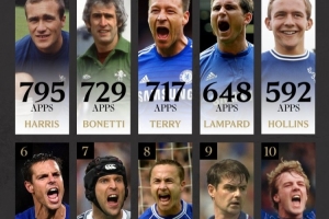 切尔西队史出场榜:罗恩-哈里斯795场第一,特里第三,兰帕德第四切尔西队史出场榜:罗恩-哈里斯795场第一,特里第三,兰帕德第四