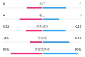 森林1-0曼城全场数据:射门9-14,射正4-3,控球率31%-69%森林1-0曼城全场数据:射门9-14,射正4-3,控球率31%-69%