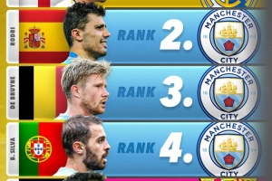 score90评选2023年度中场Top10:贝林厄姆居首,罗德里第二