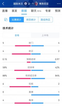 国米vs博洛尼亚半场数据:射门5-4,射正4-2,国米控球率58%国米vs博洛尼亚半场数据:射门5-4,射正4-2,国米控球率58%